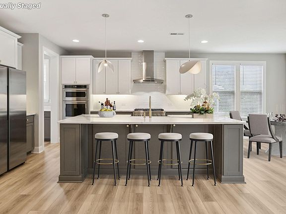Welcome to the, highly sought after, Trinity Creek community of Holly Springs! This estate style home provides 4 spacious bedrooms, 3 luxurious full bathrooms, a main floor half-bath, formal dining room, chef's kitchen with family dining room, butlery pantry, wooded backyard, as well as a multitude of high-end features and upgrades. This luxury home is only minutes away from the new FUJIFILM Diosynth Biotechnologies Campus, as well as an abundance of shopping, dining, entertainment, and outdoor excursion opportunities. The flow of the main level living space is a dream! Through the front entry, the foyer opens to a wide hallway, formal dining room, and flex space that could be a formal sitting room or office. Down the hall, you will experience open concept living room, family dining room, and chef's kitchen. Spacious and inviting, entertainment options were spared no expense. This open concept gathering space includes a gas fireplace, large media under-stairs closet, recessed lighting and surround sound, and floor electrical outlet. The kitchen was designed for a professional chef or entertainer; the commercial-style 6 burner gas range, additional built-in gas 3 shelf oven, microwave, warming drawer, an expansively-oversized island leaves nothing for want when guests are expected. Upgraded quartz countertops were installed throughout the home. The butlery pantry allows for expansive storage; as well as a perfect dry-prep or serving station. For everyday living, enter through the oversized, two-car garage (after plugging-in your Electric Vehicle into the EV Charging station) and leave your shoes and coat in the huge coat closet or 3-cubby/bench, built-in drop zone. Maximizing space and storage was a developer forethought and must be experienced in person! Ambient lighting and designer fixtures were added by the current owners. Upstairs, you will be greeted by a cozy loft landing space that would make an excellent media room, play room, or general flex space. The guest in-suite bedroom, two additional guest bedrooms and hallway full bathroom are spacious, private, and perfect for family, friends, or overnight visitors. The primary bedroom suite is luxuriously oversized and, facing the wooded back yard, adds an extra sense of seclusion. Community amenities include a pool, playground, dog park and a variety of in-community walking points. Smart home features include a Google Nest doorbell camera system and dual-zoned heating/cooling thermostats, as well as a third-party Bluetooth front door lock. Fiber optic internet available. All appliances in the home to remain. Property is subject to easements and restrictive covenants. Light fixtures above kitchen island and light fixture in guest ensuite bedroom will not convey.