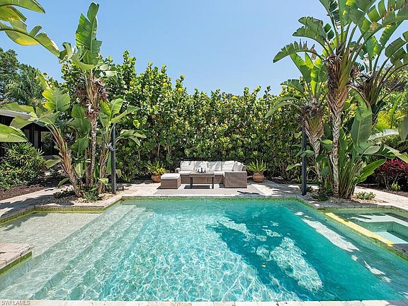 The Bamboo Bungalow is what living in Naples is all about! Located in Lake Park, just a short drive or bike ride to the beach and fifth avenue. This Lake Front house has 3 bedrooms total, one bedroom with a king size bed and den with two Queen size sleeper sofas, and 2 on suite bathrooms. The den can work as a bedroom, office, or another living space. The guest house is fully equipped with a kitchenette, bathroom, seating area, breakfast table, and one bedroom with a queen size bed. Both the guest and main house radiate a sunny and tropical atmosphere, as all parts of the house overlook the pool and lush landscape. Stroll down to the lake and enjoy a book or a cup of coffee while lounging in the hammock. Enjoy a pool front dinner with your family in one of the many outdoor seating areas. The pool gets great sun, with an eastward facing yard. Features include a pool, spa, central air, and marble flooring.