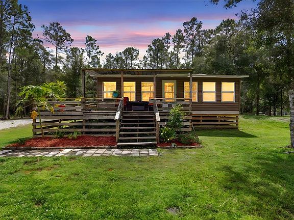 5 acres with a 1 bedroom 1 bath custom home located on the property. Tucked away at the end of a quiet road, 1200 BerryBush Street in Bunnell feels like a private world of its own. Set on 5 beautifully landscaped acres with a pond, not a flood zone, zoned for horses and cattle, this one-owner, custom-built 2020 home offers a rare blend of modern comfort and rural freedom. A long drive leads you past fruit trees and open space to a welcoming wraparound porch. Measuring 10 by 30 feet, the enclosed porch is lined with windows and cooled by its own window A/C unit, making it a place to relax in every season while looking out over your land with no neighboring houses in sight. Step inside and you’re greeted by a bright, open floor plan filled with natural light from large, double-pane insulated windows with UV coating and blinds throughout. Gorgeous laminate flooring runs through the living areas with no carpet in sight. The kitchen flows naturally into the living space with a breakfast bar and soft-close glazed cabinets, while the inside laundry room includes a washer and dryer for convenience. Outside, the property is set up for almost anything you can imagine. A spacious 24x24 detached garage is fully insulated with water and electricity, perfect for storage, hobbies or a workshop. There’s also a chicken coop and a shooting berm for outdoor enthusiasts. The home’s 6-foot crawl space has a moisture barrier and termite treatment from the time of construction, while the attic boasts 30-inch insulation for efficiency. Private utilities include a 110-foot well, septic tank, underground utilities and a water softener, giving you true self-sufficiency. This property’s thoughtful touches make it more than just a home – it’s a lifestyle. A hot tub conveys, and with the right terms several items could be included in the sale such as a John Deere tractor, furniture, lawn mower and sawmill. With vinyl siding for easy maintenance and a recent survey included, this is a turnkey opportunity for someone seeking a private oasis close to town.