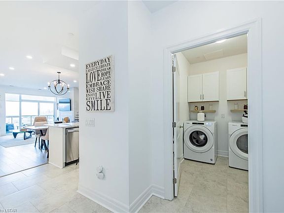 Impressive 2 bedroom + den executive condo with 2 parking spaces located in Tricar's upscale 'ParkWest' development in Byron. This immaculate 5th floor unit has been meticulously maintained and is perfect for empty nesters, professional couples and those looking for a maintenance free lifestyle while situated directly across from Springbank Park and beside all the fantastic amenities the Byron Village Plaza has to offer. This boutique unit has one of the most desirable layouts in the building and features 9' ceilings, gorgeous light hardwood floors, premium custom designer finishes, a stunning white kitchen with quartz counters & island with breakfast bar and oversized pantry , beautiful family room with electric fireplace, large den perfect for home office/guest room and in-suite laundry. Two spacious bedrooms and two full baths including a lovely Master retreat with walk-in closet and luxurious 4pc ensuite with glass shower & double sinks. Outside features a west facing private terrace with lounge & BBQ area perfect for relaxing and watching summertime sunsets. ParkWest Amenities include Fully Equipped Fitness Studio, Golf Simulator, Guest Suite, Party Room, Pool Table & Patio Area with BBQ. Low Condo Fees ($401) Include Heating, Air Conditioning, Hot & Cold Water.