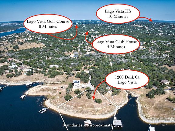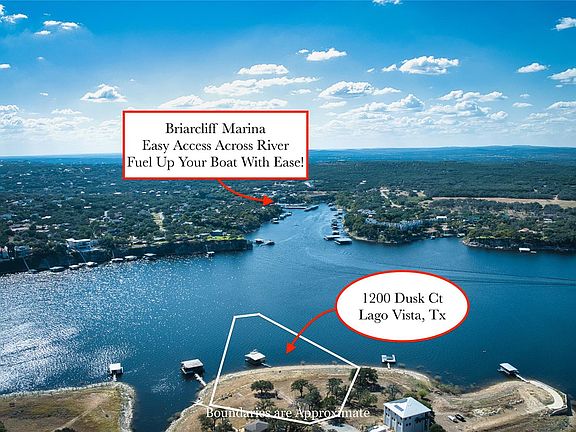 Price Just Improved + Updated Drone Photos! Now showcasing stunning new views of 1200 Dusk Court with Lake Travis at 83.5% full (as of Oct. 2025). As you arrive on Dusk Court, the breathtaking lake views immediately set the scene for this exceptional deep-waterfront property totaling 5.244 acres (two tracts) with approximately 400 feet of frontage and 1.5 acres currently exposed. See approximate boundaries outlined in photos. Utilities — electricity, city sewer, and water — are available, making it easy to build your dream home or lakefront retreat. This northeast-facing lot sits at the end of a cul-de-sac and captures southwest-facing lake views, delivering unforgettable golden-hour sunsets over Lake Travis. Enjoy direct water access from your custom boat dock, complete with boat lift, double jet ski ramp, storage closet with generator, and a 12’x16’ upper deck (constructed May 2023). Situated directly across from Briarcliff Marina, fueling up your boat couldn’t be easier — or take a quick jet ski ride across the lake to The Lighthouse Restaurant for dinner, drinks, and live music! All this within 15 minutes to Lago Vista shopping, dining, and entertainment, 30 minutes to Leander/Cedar Park’s 1890 Ranch, The Parke, and H-E-B Center, and about 30 miles to The Domain and Q2 Stadium. Highly rated Lago Vista ISD! Residents enjoy Lago Vista POA amenities including pools, fitness facilities, pickleball courts, campgrounds, and more — all for just $150/year. Low 2.0834% tax rate! Motivated sellers say SELL IT! Don’t miss this must-see Lake Travis waterfront opportunity, now priced at $975,000.
