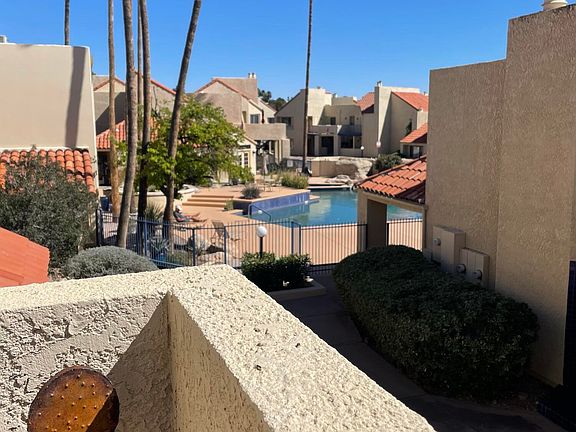 Upstairs 2 bedroom 2 bath furnished condo in a great location with community pool, spa, fitness center plus near Rillito river bike path & walking trail.Nice split floor plan features a wood burning fireplace in the living room, new flooring and recently remodeled kitchen with new s.s. appliances and this unit also includes the washer/dryer. Primary bedroom suite features queen bed, a small private balcony, mirrored his & hers closets, dual vanity sinks and shower. Guest bedroom with dual vanity sinks and tub. Guest bedroom with 2 twin beds.This unit has a view of the pool from the sunny balcony and no carpeting!