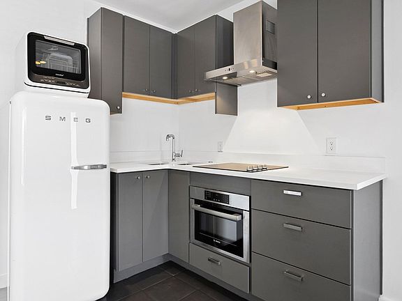 Freestanding smeg refrigeratorBosch appliancesHighly efficient floor planDowntown viewsCommercial-grade aluminum windows
