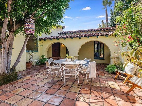 Picturesque 1930s Spanish Revival home nestled on a quiet tree-lined street in the coveted Rossmoyne Historic District of Glendale. This 3bd/2ba, 1880 sqft main house + 1/1, 375 sqft guest house features beautifully maintained quintessential period architecture adorned with curved archways, hand-painted wood beamed ceilings, terracotta roof tiles and an enchanting courtyard, perfect for entertaining. A Spanish tiled walkway leads you across the drought-tolerant landscaped front yard and through a whimsical gated courtyard to the main house, which is brimming with architectural elements. Enter through the arched front door adorned with hand-carved details and iron grill. Step down to a large living room flooded with natural light through flanking windows that highlight the decorative fireplace, vaulted ceilings and a stunning original lead and stained glass picture window. Formal dining room and breakfast nook overlook the courtyard. Quaint kitchen with butcher-block countertops, updated cement tile floors, stainless steel appliances, and a walk in pantry. Three generous bedrooms with ample closets and storage space and original hardwood floors throughout. Two ensuite bathrooms both feature original colorful tile work. French doors off the primary bedroom lead out to the fully fenced and landscaped backyard that is ideal for relaxing, entertaining, or dining alfresco under the pergola. The guest house, adjacent to a full separate garage, is complete with a small kitchen, three quarter bath, laundry room and sunroom perfect for a home office, art studio or gym. This is truly a remarkable and stunning property to call home!