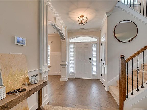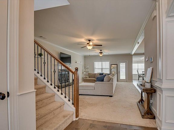 Exterior with Stone Water Table Squared Columns. Gorgeous hardwood floors! Gourmet kitchen w/huge island/breakfast bar, large sink, pots/pans drawers, built in microwave, silent dishwasher, gas stove top & large pantry opens up to both keeping room with coffered ceiling & large living room with fireplace! Awesome dining room w/wainscoting & nice ceiling treatment! Spare bedroom & full bath w/upgraded tile floor on main level! Owners suite w/tray ceiling & 2 walk in closets...1 is connected to laundry rm (laundry also accessible from hall)! Plus double sink vanity, tile floor, upgraded tile shower, separate tub, linen closet& water closet! 3 additional spare bedrooms & full bath w/double sink vanity & upgraded tile floor! Covered patio! Full sprinkler! Built in sound system & wiring to back patio! 2 zone heat/air! Two 50 gallon hot water heaters! 2 inch blinds!