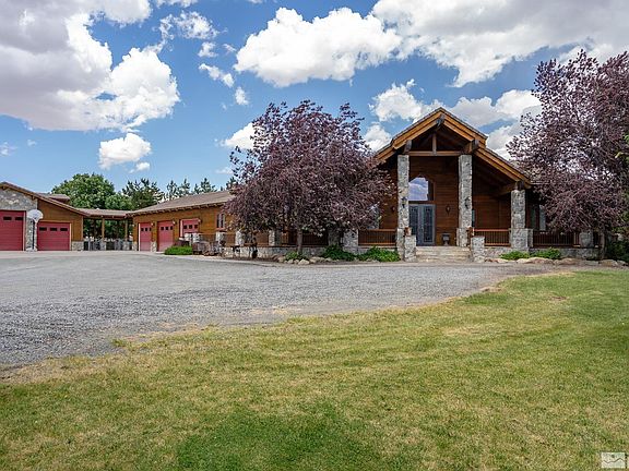 A Tahoe style home on 56 fully fenced acres. A great room concept with rock accents, wood ceilings & beams. The east wing has an office/library, gym, laundry room, 3 en suite guest bedrooms, sunroom & master bedroom. A formal dining room, sewing room, pantry & mudroom are on the west wing. The master has his & her closets with separate entrances, travertine bath with an air jetted tub and a large covered porch. Attached 1333 sf garage, detached 1980 sf garage, 3452 sf steel shop and dog run with shelter., The home is equipped with central vacuum, tank less hot water heaters, water purification system and two newer furnaces and compressors. The detached garage has plenty of attic storage, ½ bath, storage room and a gas heater. The barn has two large roll up doors on either end, a roll up side entrance and a 250 sf storage room.