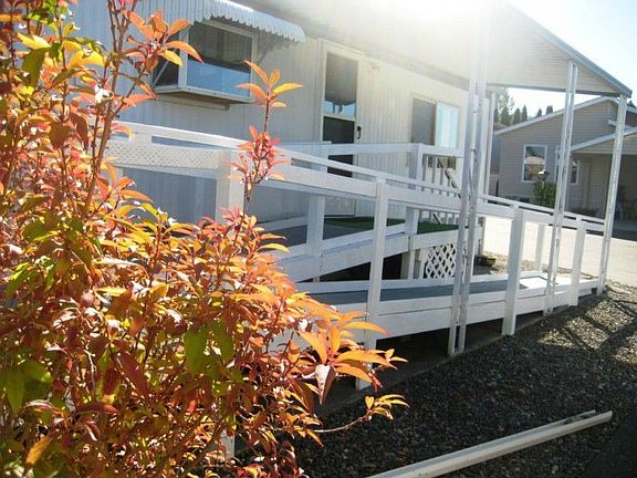 Looking for an affordable handicapped accessible home for someone 55+? Look no more! This one has been scrubbed inside and out, carpets just cleaned, and is spit spot & ready for new owners. It even has air conditioning. The side yard has an ample-sized storage shed with power. The grounds are tastefully arranged with rock and flower gardens. Excellent location for shopping,dining, city transit and the clubhouse hosts social activities every month. Small pets are allowed. Priced to sell quickly.