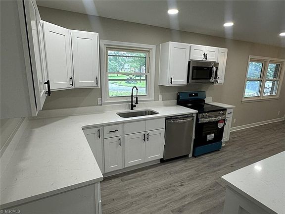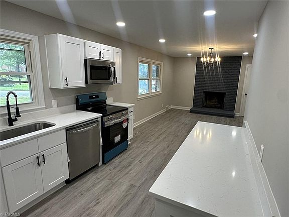 Finished basementCozy fireplaceOverly large bathroomLarge fenced backyardLarge denRedesigned kitchen