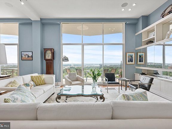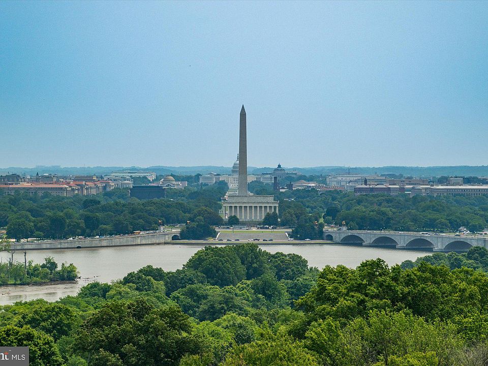 Welcome home to one of the most beautiful homes with the most river and city views you have ever, or will ever, see. An absolute jewel of an offering, this extraordinary residence is a fully reimagined combination of 2 units into one magnificent home. 2 stories, 2 Bedrooms, 2 bath, 2,200 square feet of exquisite and functional design, sprawling outdoor space with sweeping, year-round, views of the Potomac River and of DC’s most iconic monuments. Imagine Summer nights spent listening, from your balcony high above, to the Marine Corps Band or the bells of the Netherlands Carillon or hosting the 4th of July party with the best view in town. #838 is located at Prospect House, a mid-century modern building renowned for its unique architecture and panoramic views and featured in James Goode’s Best Addresses: A Century of Washington’s Distinguished Apartment Houses. Upper-Level Features: Gracious receiving foyer with walk-in closet and dumbwaiter with access to Kitchen. Main-Level Features: Spectacular, open stair case leading to the main level with floor to ceiling windows; beautifully curated space designed by acclaimed interior designer Lisa Vandenburgh and Scott Moomey of Muse Kirwan Architects; oversized, open Living Room with 17’4” ceiling, transparent ceiling fan, access to outdoor space and gorgeous built-ins; large Dining Room with 17’4” ceilings, Emanuel Morez chandelier, vintage mid-century sconces, stunning views to dine by and access to outdoor space; fabulous, Cook’s kitchen with large breakfast bar that seats 4; honed marble countertops, stunning gold gilt painted with glass overlay backsplash, modern, glazed cabinetry to the ceiling, built in stainless steel appliances (Bosch, Café and Jenn Air), island, recessed lighting and walk in pantry; cozy Library/Office with built in, open shelving and hand glazed walls; Primary Suite with 2 custom designed walk-in closets, ceiling fan, Carrera marble bath with stainless steel fixtures and glass surround, custom filagree sconces and light, and large vanity with storage; Bedroom #2 with large walk-in closet, ceiling fan, and Full Bath with tub, Silestone vanity and quartz/slate walls and floor; hardwood floors throughout; discreetly placed, whimsically designed Powder Room with raised Onyx bowl and backlit resin mirror; 42’ balcony across the rear of home accessed through brand new floor to ceiling sliding doors. Other Features: 4 zones in unit, remote controlled window treatments in Living and Dining Rooms, dumbwaiter, East West exposure for excellent cross ventilation Condo fee includes all utilities including water and building amenities (pool, fitness, common areas). Prospect House has received an A+ rating by its auditors. Prospect House is sited on 5-acres of meticulously landscaped grounds and features an Olympic-sized swimming pool and new elevators 2 parking spaces, separately deeded, G2 #249 & #264 Prospect Market (convenience store) on site, walk to Safeway, Whole Foods and GW/Mount Vernon path, 5 blocks to Rosslyn Metro (Silver, Orange and Blue), The Crossing Clarendon for shopping, fine and casual dining and easy trip to Pentagon City Mall, Roosevelt Island or Georgetown, commuter’s dream with easy access to Route 50, GW Parkway and I-66.