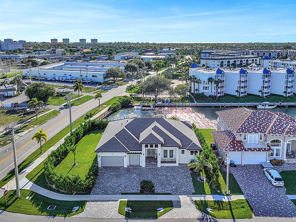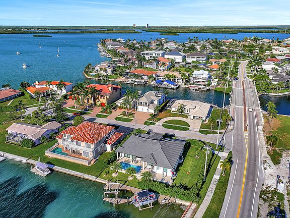 Beautiful new coastal contemporary custom-built in 2022 residence with Southwest exposure and quick direct access to the Gulf of Mexico. Located on an oversized corner lot this stunning 4-bedroom, 3 bath home features many top-quality finishes throughout with an open concept great room, gourmet chefs' kitchen, island with breakfast bar, separate dining area, large walk-in pantry, custom cabinetry, quartz counter-tops, built-in wall oven, electric cook-top, wood-plank tile floors throughout, impact windows and sliders, coffered and tray ceilings and bar area. Split bedroom floor plan provides privacy for your guests. Relax and enjoy picturesque sunsets and wide water bay views from your spacious lanai with custom pool, summer kitchen and built-in gas grill. A large dock with two lifts 16k & 20k makes this a premier location for boaters and nature enthusiasts alike. Circular drive, 3-car garage, and 500-gallon propane tank. Newer Seawall installed in 2006. Close to shopping and restaurants, this is the perfect opportunity to start living in paradise today.
