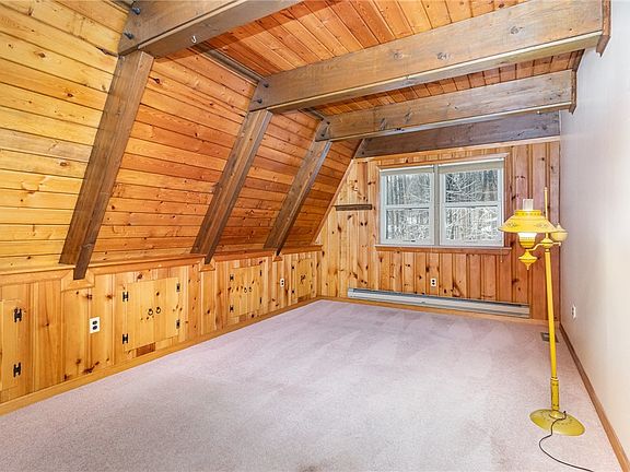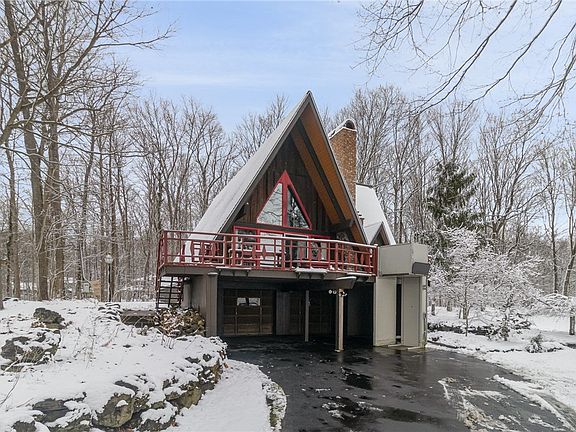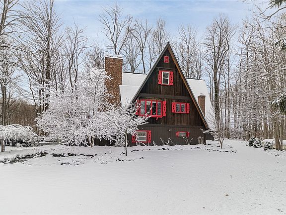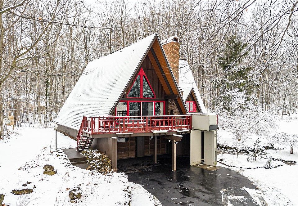 Nestled on a private 4.5-acre lot, this charming 3-bedroom A-frame home offers peaceful living set back off a quiet rural road. The spacious great room features beautiful cathedral ceilings, a stunning stone fireplace, and massive windows that flood the space with natural light and gorgeous views. The sliding glass door leads to the balcony which is perfect for relaxing or entertaining. The master suite includes a huge walk in closet, it's own bathroom and a cozy loft sitting area that overlooks the great room, providing a tranquil retreat. The eat-in kitchen is equipped with a new dishwasher and a newer refrigerator. The large basement has a dry bar and wood stove, ideal for gatherings or additional living space as well as plenty of storage space. With a two-car attached garage and a barn with a workshop you can enjoy endless possibilities. This home is the perfect combination of comfort and practicality, with plenty of space for outdoor enjoyment. Your very own private retreat! Schedule your showing today! Delayed Negotiations to be held on 1/27 @ 2:00pm