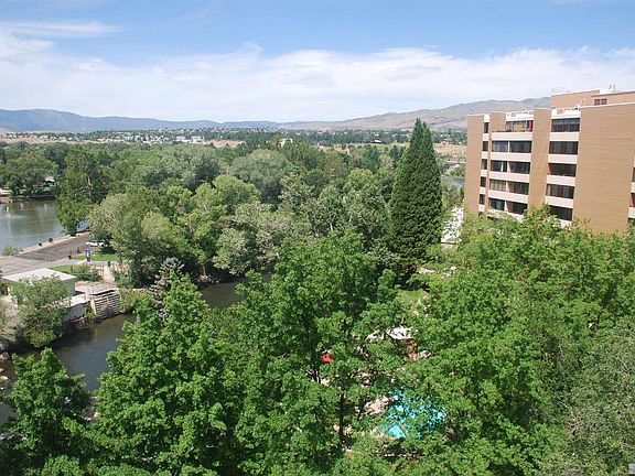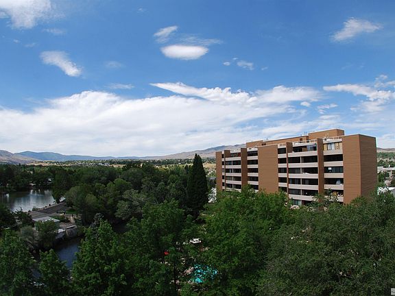 Enjoy a serene home life on the banks of the Truckee River. This 10th floor unit is above the tree line with outstanding views of West Reno. Enjoy all the seasonal delights from every room: spring foliage, carpets of fall colors, as well as the peaceful silence of winter snows. It’s an easy walk to downtown Reno along the river Walk or cross the river to Idlewild park to enjoy nature or Food Truck Fridays from May-August. Close to the many Reno/Sparks golf courses and Reno/Tahoe ski resorts., HOA fees include garbage, water and common area maintenance. One parking spot in basement garage is included. Clubhouse is available for use for get-togethers and has some exercise equipment. Pool is heated. BBQs are on a first come, first served basis. Heating and cooling in unit is achieved by hot or cold water running from roof to basement and fan in unit blowing over pipes. Temperature is controlled by thermostat in the unit. Tax assessor says unit is 1304 sq. ft. with 100 sq. ft balcony. Balcony has been incorporated into the unit’s square footage for a total of 1404 sq ft.