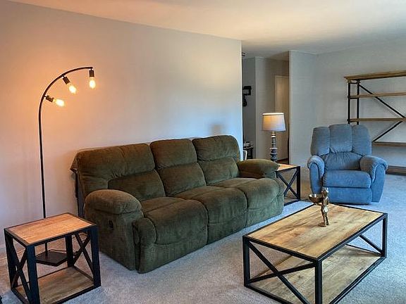 - Living Room: Couch, recliner, coffee table, end tables, and a 55" TV