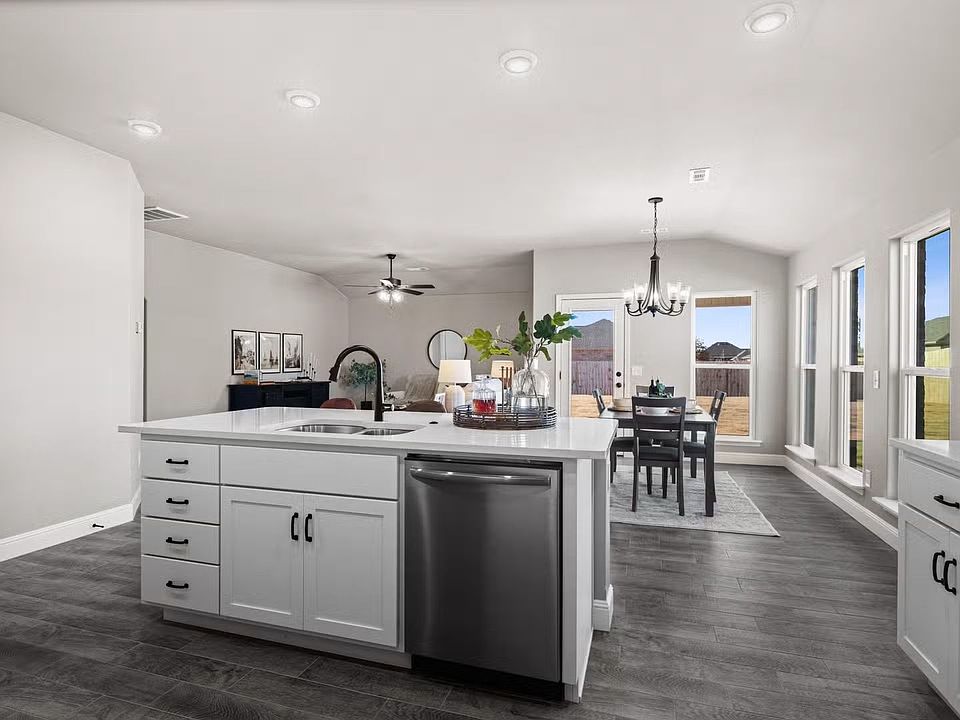 This specific home is 1,550 square feet and features 4 bedrooms, 2 baths, and a 2 car garage. The kitchen comes with granite countertops and ALL appliances; a new fridge, dishwasher, stove, and a microwave. There are also custom cabinets and vinyl flooring that extends throughout the home, which means NO carpet to clean! Notably, these homes come with an incredibly spacious grass backyard and a brand new fence, perfect for pets and families to enjoy.