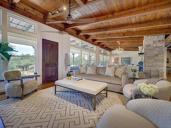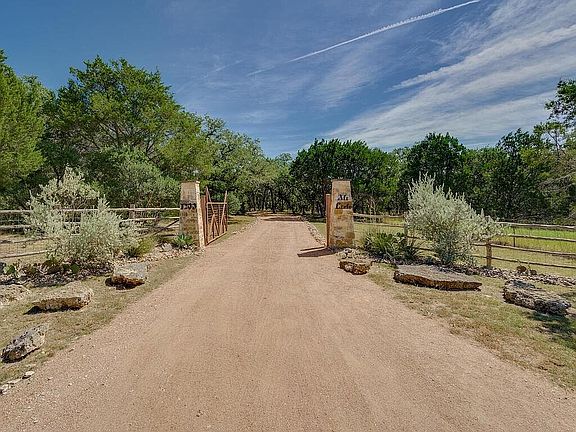 Unique and enchanting, private gated and fenced family compound on 10.1+acres with hill country views. Interior completely renovated in 2019! Decomposed granite driveway with river rock edging, 6 rain catchment tanks plus well, hot tub, 2 fire pits, Par 3 golf course, includes nine tee boxes (ranging from 25 to 110 yards) and custom 65' X 34' putting and chipping green installed with the DavePelz ShotStopper system. 130 yard rifle & pistol shooting range with shotgun area for skeet. Main house offers 896 sq ft covered veranda. Guest Casita, Separate game room with wrap around veranda porch. Updates include: refinished pine floors, new pine interior doors, custom flush inset cabinets with Cesarstone countertops, Walker Zanger tile, Thermador professional series appliances including 36" gas range and built-in coffee & espresso maker. Marble primary bathroom with custom California System in closet. Invisible fence system with large dog kennel and separate cat kennel. Do not miss this exceptional serene escape just minutes to the Blanco River and downtown historic Wimberley.