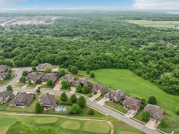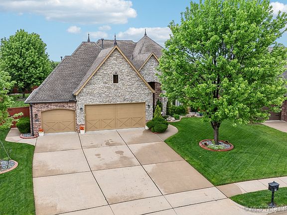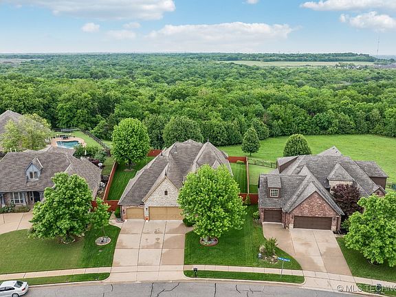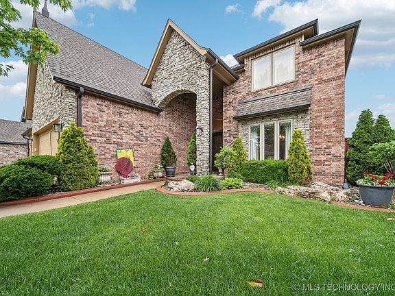 This meticulously maintained, Executive one-owner home has so many luxury updates and upgrades only coming to see it will give you the full picture... but here's a bit of what awaits you: An impressive solid wood entry door, a welcoming grand foyer, tumbled travertine and hardwood flooring. In the kitchen, granite countertops and travertine backsplashes, solid wood cabinets, under-cabinet lighting, and stainless steel GE appliances. Recently updated designer light fixtures, an expanded butler's pantry, custom crown molding and baseboards. In the living room, a statement-making stacked stone fireplace with a Heatilator. The Primary suite has patio access, beautiful bay windows and blackout blinds, in-wall doggie-door, massive seasonal closet and family safe room, 2019 Jason Whirlpool, and a large step-in shower with a built-in bench. In the three bay extended garage is a work sink, epoxy flooring and attic lift and just inside the garage entrance is a dropzone/mudroom/laundry room with masses of storage. Outdoors enjoy professional landscaping with French drains, a sprinkler system and privacy fence. The home has Pella windows and storm doors with internal blinds, fresh interior paint, 2015 updated exterior house and deck paint, a whole-home Generac surge protector, monitored security system with LAN, a central vacuum, and a 75 gallon water heater. Best of all... the 1,000 square foot stamped concrete patio with a gorgeous view of the trees and hills of Northeastern Oklahoma.