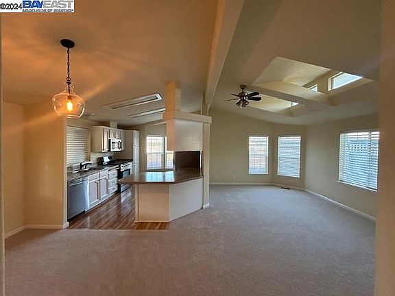 Newer manufactured home in Hayward Mobile Country Club (adult 55 community) features: 2 bedrooms; 2 full baths; new carpet and paint; kitchen with stainless steel appliances and eat in area living room with 2 cell clear story skylight; primary suite with walk in closet and private glamour bath with soaking tub, stall shower, and 2 sinks; laundry room with washer and dryer included; low space rent; corner lot