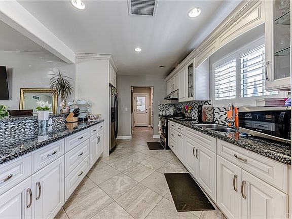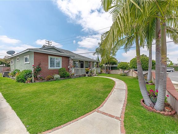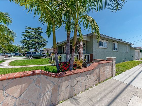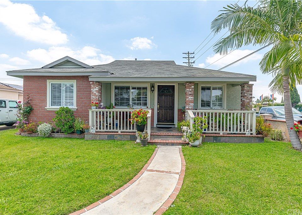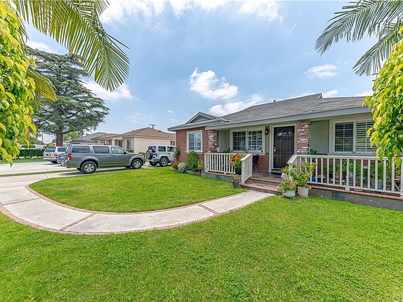Bright Beautiful open concept home on a corner lot with classic curb appeal and an enormous backyard. This charming brick faced corner home has an immaculately maintained front lawn with a beautifully brick lined driveway. The brick walkway will lead you to the invitingly large front porch with flagstone pavers, room for sitting and relaxing, and the beautifully stained wood front door. Enter to many upgrades, well maintained wood floors, scraped ceilings, recessed lighting and plantation shutters. The large galley kitchen has been updated white Shaker cabinets, new hardware, crown molding, full mosaic tile backsplash, gas range/cooktop and more counter space than any chef would need. The family room is very cozy and bright and opens up to the kitchen and dining room. Adjacent to the kitchen is a nice cozy space with pantry storage and built in coffee bar with matching granite counter. Laundry room is very large and bright with a seating area and a sliding glass door that lead to the enormous backyard. The master bedroom has mirrored closet doors, large windows and leads to an updated en suite with huge walk in shower. The other 2 good size bedrooms share the other spacious upgraded bathroom with lots of storage room and shower in tub. Enjoy the large roomy backyard with a covered patio, concrete pad lined with brick pavers and very nice landscaping throughout. Walking distance to many shopping centers and schools. Close to the 22, 5, & 405.