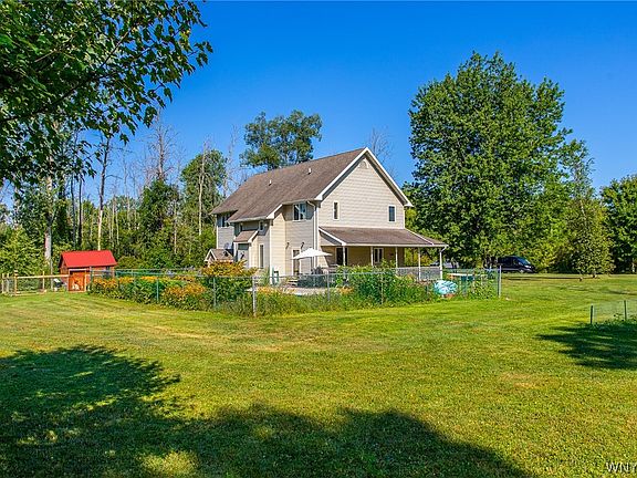 Welcome to 12003 Rapids Rd in wonderful Akron, NY. This 5 bed 2.5 bath home sits on 15 acres and is ready for it's new owners. There was a bedroom added upstairs in 2018 making the square footage closer to 2500. Nothing to do but move right in, and relax by the pool. Beautifully updated kitchen with custom cabinets, and granite countertops. Large family room area with vaulted ceilings, and a natural gas fireplace. First floor bedroom, half bath, and nice foyer/entry area. Upstairs takes you to 4 generously sized bedrooms, and 2 full updated bathrooms. Basement is finished with means of egress, updated boiler with endless hot water tank, central ac in the upstairs and a mini split system to cool the downstairs. This house is well built and super efficient on the energy bills. Attached 2 car garage, and detached pole barn. Chicken coop and chickens can stay, as well as a great shed for storage. Liner replaced on the pool 3 years ago. .