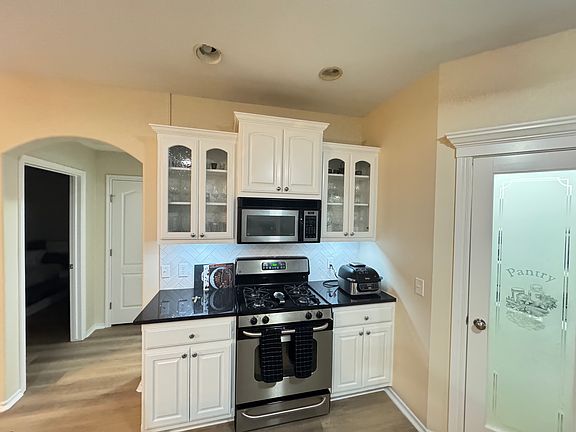 Open kitchen with black granite counters and white cabinets Plenty of storage and a large pantry