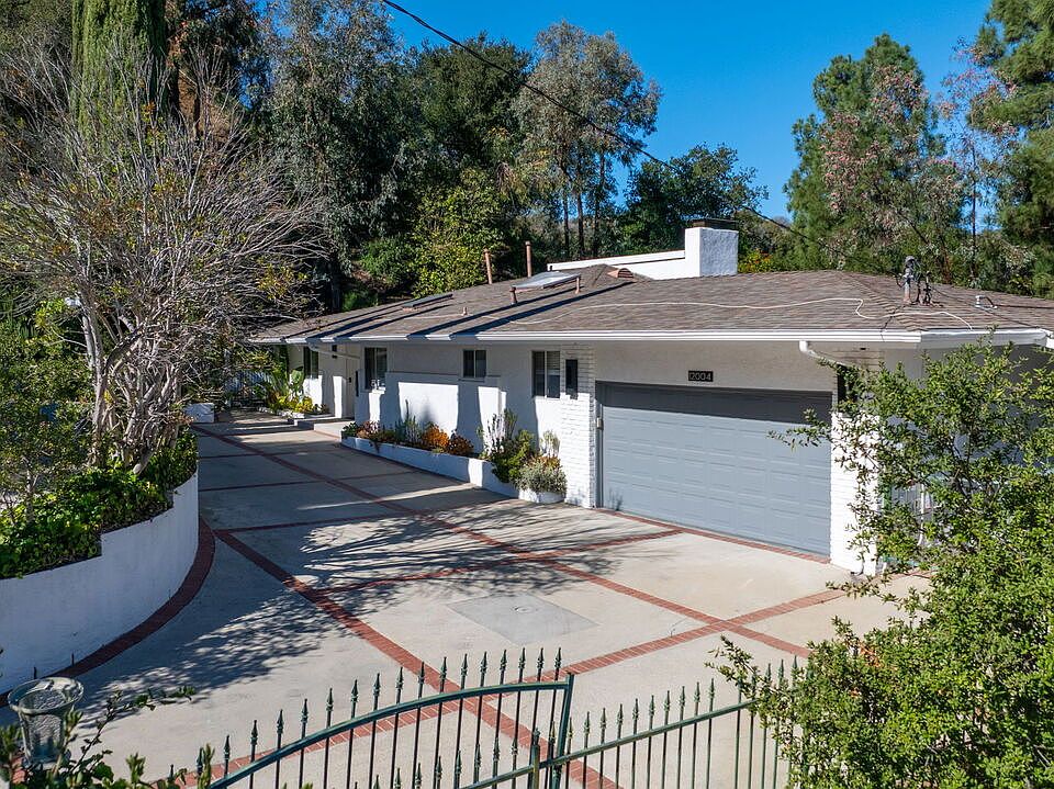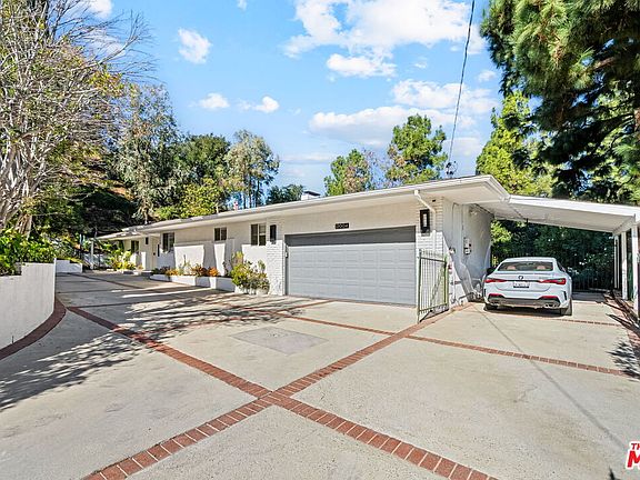 Located in a highly sought after enchanting enclave in Fryman Canyon. For those that value privacy and seclusion in a canyon setting, this home is at the end of the street and up a long driveway situated on a knoll elevated far above the street. Surrounded by nature and beautiful landscaping, this is a sprawling one-level 4 bedroom, 3 bathroom home plus separate media room/den. Large formal skylit entry and hardwood flooring throughout most of the home, spacious entertaining living room with soaring ceilings, lots of skylights and a fireplace with an open concept to the dining room and a large chef's kitchen with newer stainless-steel appliances all with pleasant views to the backyard and canyon. Beautiful private primary suite with walk-in closet and luxurious bathroom looking out to the lovely backyard. Other features include a nice size new TREX deck leading to the beautifully private flat grassy yard with room for pool and separate tranquil outside entertaining areas with peaceful fountains, a separate laundry room, 2 car garage with direct access into the home and an additional carport. A very special offering.