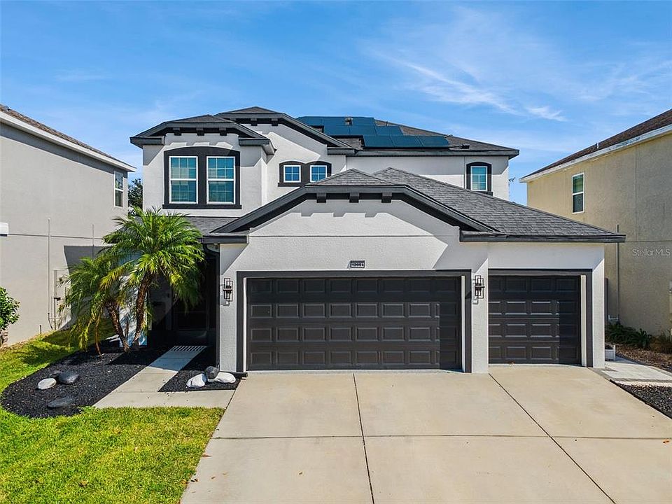 Your Forever Home at The Enclave at Ramble Creek awaits you – Solar Panels recently Paid in Full! Welcome to 12004 Rambling Stream Drive, a one-of-a-kind luxurious residence nestled in the tranquil and highly sought-after community. This gorgeous 4-bedroom, 2.5-bath pool home, complete with an air-conditioned 3-car garage featuring premium epoxy flooring, blends sophistication, comfort, and resort-style living in perfect harmony. From the moment you arrive, the home’s striking contemporary paint design sets it apart as the crown jewel of the neighborhood. The newly screened-in front porch offers a peaceful space to greet guests or enjoy your morning coffee while taking in the serene surroundings. Inside, the semi open-concept layout invites relaxation and entertainment. The home exudes elegance. You will immediately notice and appreciate the elegant stylish chandeliers and LED ceiling fans that were all recently upgraded throughout most of the home. Ceramic plank flooring flows through the formal living and dining spaces into a chef-inspired kitchen adorned with sleek quartz countertops, custom tile backsplash, and top-of-the-line appliances. The first floor includes a private bedroom with French doors and walk-in closet, great for guess stay or live-in in-laws. The true showpiece of the home lies beyond the family-room glass doors of the home, a tropical paradise! The tranquil backyard retreat is surrounded by beautiful palms which provides style and privacy. The huge, covered lanai, boasts an outdoor bar and grill design that combines functionality with an appealing aesthetic to create a natural extension of the home's living space and provides an inviting atmosphere. The lanai also includes a large eye-catching selfie wall, specifically designed for exterior backdrop and intended for taking and sharing photos. Beyond the covered lanai, lies a sparkling saltwater pool, surrounded by a freshly painted deck protected by a clear-coat finish for lasting beauty. The ambiance is elevated by the pool cage color-changing outdoor lighting controllable by remote, creating the perfect mood for evening gatherings or quiet reflection under the stars. Upstairs, discover a loft converted into a private stylish theater room with striking dimmable lighting and chandelier creating ambiance and style, enclosed by elegant French glass doors - Ideal for a bonus entertainment space. The primary suite offers a luxurious escape with a garden tub, walk-in shower, and spacious walk-in closet with custom shelving, ensuring both comfort and privacy. Every detail of this home is esthetically pleasing and has been carefully curated for peace of mind, including Vivint security cameras on all entries and a roof reinforced with protective coating (Feb 2025). With fully paid solar panels, NO CDD fees, and low HOA ($100 quarterly), this home combines elegance and efficiency with exceptional value. Enjoy the small-family charm of The Enclave community to include top-rated schools, just minutes from major highways, shopping, dining, and a short drive to Tampa’s vibrant downtown and beaches. Experience true comfort, where elegance meets tranquility—schedule your private tour today and discover why this extraordinary home is unlike any other in the neighborhood and will not last long! Extreme luxury, tranquility and value await you in The Enclave on Rambling Stream.