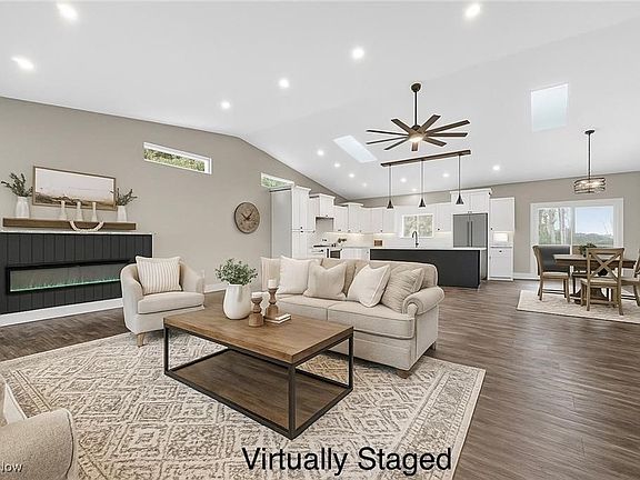 Step inside to an open-concept great room with vaulted ceilings, skylights, and a stunning 5-foot linear fireplace that instantly feels like home. The gourmet kitchen is a showstopper — featuring a massive 10-foot center island, custom Shaker cabinetry, tiled backsplash, granite countertops, and a huge eat-in area ALL with amazing panoramic views