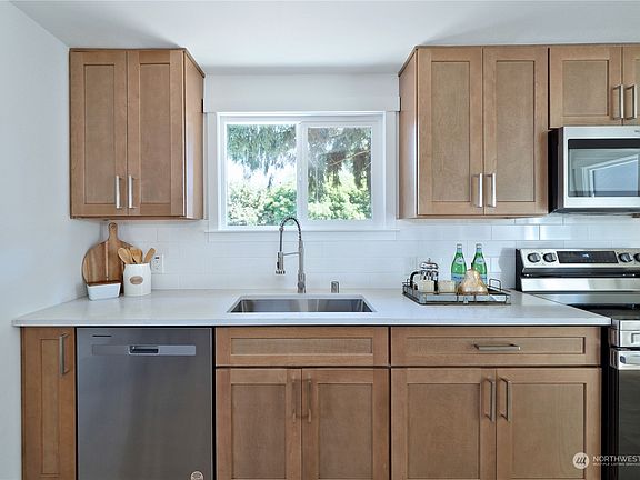 Turnkey starter home perfect as first home or investment. Home has been tastefully updated with new luxury vinyl plank flooring, solid wood cabinets with 3cm quartz countertops, and stainless steel appliances. Galley style kitchen with plenty of cabinet/storage space and separate dining area. Brand new tub, tile work, and fixtures in bathroom. New 30-year composition roof, double pane windows, doors/trim, fresh coat of interior and exterior paint, and hot water tank. Updated electrical service and panel. Long driveway to park multiple vehicles. Spacious 6,600 sqft lot with alley access - potential to build ADU. Convenient location just minutes to freeways, highways, schools, parks, grocery shops, DT Renton, and Boeing.