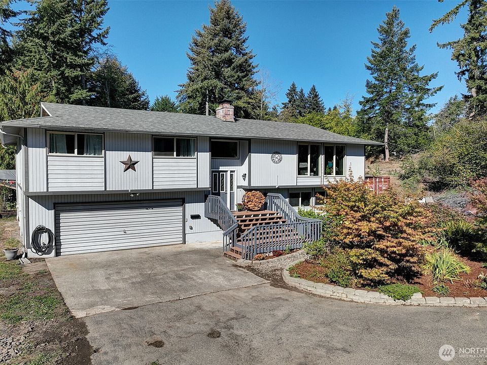 Great home tucked away on over 3/4 acre lot offers space for all your toys and plenty of parking and no HOA! Conveniently located to shopping, schools and commuting routes. Upstairs features 3 bedrooms including a primary suite with 3/4 bat, walk in closet and door out onto the back deck. Spacious living room features wood burning fireplace and floor to ceiling windows that bring in lots of natural light.Downstairs includes large bonus room with wood burning fireplace, laundry room and half bath. Freshly painted back deck and front porch railing and trex decking. Get ready to make this house your home!