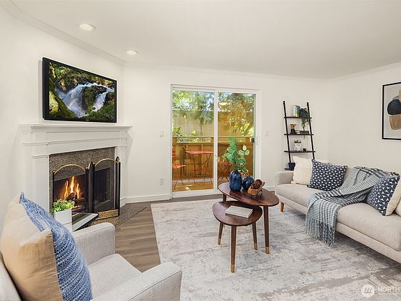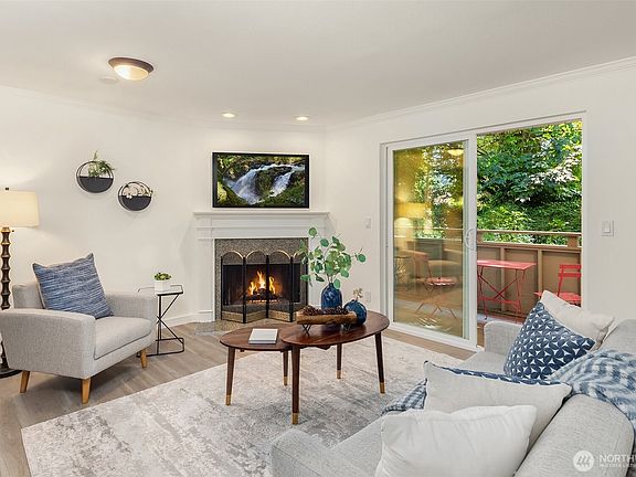 Rare 1250 sq ft, end unit, 3-bedroom condo provides sought-after one-floor living in a flexible floorplan. Peaceful view of tall trees, nestled in nature. Spacious kitchen offers new appliances, quartz countertops, pantry, desk, moveable island, built-in eating nook. Living room graced with cozy fireplace for those cool evenings, opens onto private deck. Huge primary suite includes updated walk-in shower, walk-in closet and private deck. 2nd bed/office, full hall bath. 3rd bedroom with half-bath. Fresh paint throughout. New vinyl plank floors. Full-sized washer+dryer. Forced air furnace heat. 1 carport parking space + first-come uncovered parking. Additional storage room. Stellar location close to Juanita Village and Beach. Rental cap met.
