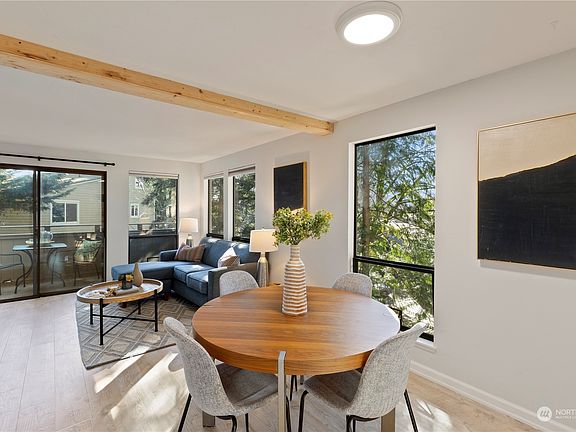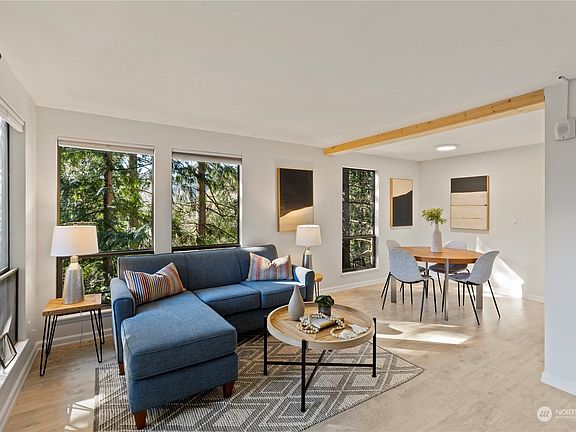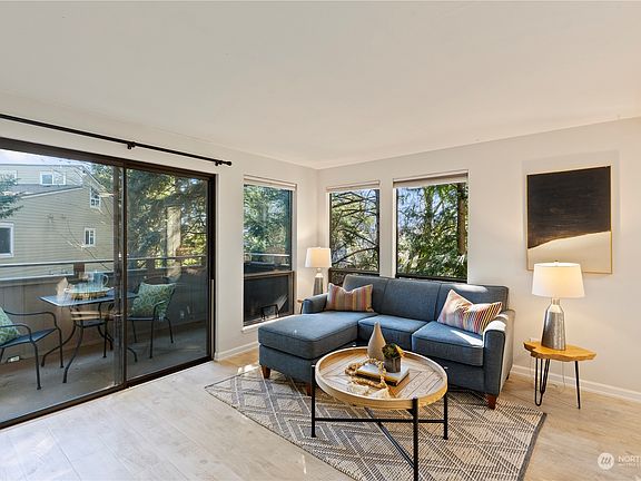 Top floor end unit, fully updated & nestled in nature! This 2 level home offers new paint throughout, new trim, popcorn removed, a natural wood beam, whitewashed rock fireplace, and laminate hardwood floors on main & upper level. Everything was thought of! Main level includes living room, dining room, fully updated 1/2 bath, eat-in kitchen with granite counters, undermount sink, and new modern shelves. Upper level includes 2 generous bedrooms with a primary bedroom deck & second bedroom walk-in closet, a fully updated main bath, and full sized washer and dryer! Storage off the main deck. Additional storage in a secure unit by the garage. Great area located by shopping, Juanita Village, the waterfront park and all Juanita has to offer!