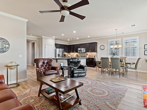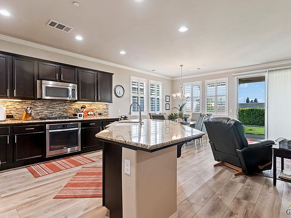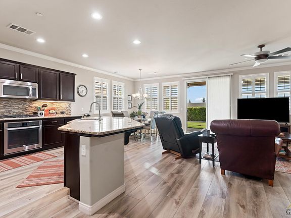 Welcome to Brighton Parks 55+ Gated Community Living. Pride of ownership, this well kept home is loaded with lots of upgrades. Enjoy 2 bed + 2 bathrooms split wing wing home with tall ceilings and a open great room concept with crown molding, tall entry door, wood look laminate flooring, carpet and window shutters throughout. Kitchen includes recessed lighting, whirlpool stainless appliances, dark brown cabinets with brushed nickel handles, island granite counters with full tile backsplash and under counter lighting. Master bath includes walk in closet, upgraded flooring, granite counters with double sinks and a custom tile/stone walk-in shower. Other features include Spanish style roof, block and vinyl fencing extra wide covered patio.