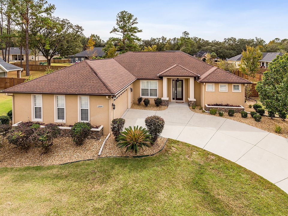 Concrete block beauty in Fletcher Park! Custom built in 2007 this welcoming floorplan with 4 Br, 3 BA, 2527 square feet offers features like: spacious open kitchen designed to entertain with upgrades like granite counter tops, full appliance package, wood cabinets, double door pantry,breakfast bar and a large island ready to serve your guests. Welcoming entrance with a large(8 ft) luxury glass front door, high 9-10 ft ceilings bring in lots of natural light. Designer details include crown molding, decorative niches, tile floors, tile backsplash and Plantation shutters. The 3 guest BRs flow well w/ Jack and Jill baths w/ dual sinks, and the 3rd bath has a door to the outside covered lanai for outdoor activities on the almost .5 acre fenced, level lot. Plenty of storage in the oversize(600sf) 2 car garage and inside laundry with sink and cabinetry. Plenty of room for your family and guest in the formal living room, family room, dining room and breakfast nook. Large master bedroom with a luxury bath that includes double sinks, corner tub and a separate shower. The 4th BR and 3rd BA would make a great in-law or teenage suite. Hidden Oak Elem (10/10 rating), Kanapaha middle & Buchholz high school. Community playground.