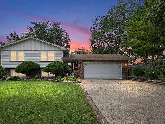 Welcome to this inviting split-level home in Derby Meadows, offering 4 bedrooms, an office, and a versatile bonus room. Set on nearly a quarter-acre, the property backs directly to Yangas Park with walking paths, tennis courts, and open green space just beyond the backyard. The yard offers the enjoyment of mature peach trees, pear and apple, lush plantings, a rainwater collection system including IBC and rain barrel, a shed equipped with power, and a pergola, perfect for enjoying outdoor time. The spacious screened-in porch overlooks the yard and park, creating a comfortable space to relax and take in the view. Inside, the main level foyer offers direct access to the upper and lower levels, garage, and yard. The layout features an eat-in kitchen, combined living and dining room, and a comfortable family room. The lower level also includes a bedroom with adjoining bonus room, office, and exterior access to the backyard. Conveniently located near shopping, dining, Metra, and major roadways, this home offers a blend of indoor comfort and serene outdoor living with direct park access.