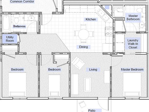 Spacious, open floor plan apartment in small 12 unit community with amenities including washer and dryer, dishwasher, garbage disposal, and off street parking.