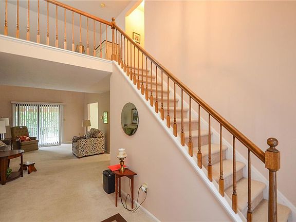 Maintenance free living in this exceptionally cared for condo, situated in a serene, private subdivision in North Bethlehem. This 2 bedroom, 1.5 bath end unit offers a private, tree-lined backyard with a rear deck covered by a retractable awning; the perfect space to relax! Welcoming you inside is a two story Foyer entrance w/ skylight and a convenient powder room. The living room has sliders to access the rear deck and patio. Adjoining the living room is a formal dining room followed by the kitchen with a custom built in pantry storage and access into the garage. The second floor offers a nice sized loft area w/ closet, 2 bedrooms with plenty of closet space and a full bathroom. Additionally, there is a full basement with ample storage and laundry area, an attached 1 car garage, driveway parking and overflow guest parking. Condo fee includes grass cutting, snow removal, cable TV, trash removal, painting of front door & deck and power washing of exterior home as needed. Estate sale and is being sold as is.