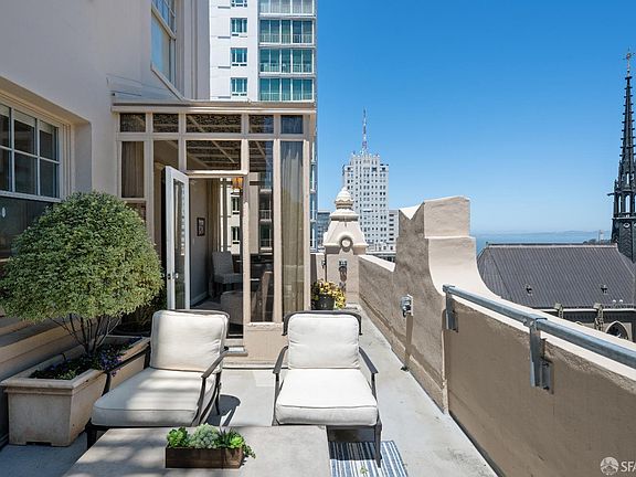This elegant pre-war apartment atop Nob Hill's 1201 California blends classic sophistication with modern enhancements and panoramic views. The elegant living room with fireplace serves as the home's centerpiece and opens to a radiant sunroom offering iconic San Francisco views. Just beyond the sunroom-one of only three in the building-a prized private terrace offers dramatic views of Grace Cathedral and the city skyline. The second bedroom or den off the living room enjoys full Golden Gate Bridge views and sliding glass doors for privacy. Adjoining the living room, a formal dining room with integrated cabinetry leads to a beautifully appointed kitchen, outfitted with stainless steel countertops, tiled walls, and a premium Miele and Sub-Zero appliance suite. The primary suite-boasting more views of the Golden Gate Bridge-includes a walk-in closet with custom storage and a refreshed bath clad in striking mirrored onyx walls. Additional highlights include: recessed lighting, richly toned oak floors, a second full bath, and a whole-home sound system, all enhancing the comfort and refinement of this gracious home. Adjacent to Huntington Park and Grace Cathedral, enjoy 1201's 24/7 door staff, expansive landscaped garden terrace, roof deck, storage, available parking and more.