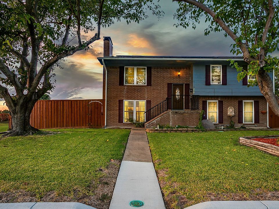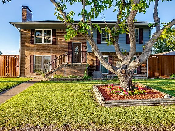 From the moment you step into this home, you can feel the story it’s been writing! This unique split level home is only on its second owner and is ready for the next chapter to be all yours. Curb appeal stuns on this corner lot with it's mature trees, flower beds, and privacy fence with a rounded gate out front. The split level design welcomes you with a spacious downstairs living room anchored by a brick fireplace with gas logs and a raised hearth, perfect for cozy evenings! Here you’ll also find a half bath, convenient laundry space, access to the garage, with French Doors to the enclosed patio! Upstairs, the heart of the home unfolds with an additional living room that overlooks the entryway’s flickering candle style chandelier, setting a warm and inviting tone. The eat in kitchen is a chef’s delight, featuring rich walnut butcherblock countertops, a double oven gas range, built in microwave, dishwasher, and disposal. A buffet style breakfast bar makes mornings easy and gatherings effortless! The adjoining sunroom offers a bright, flexible space that brings the outdoors in. The spacious primary bedroom feels like a retreat with barn doors and a large window bringing in natural light, while the ensuite bath elevates comfort with a wood style tiled alcove shower, pebble stone flooring, hidden medicine cabinet, and even a bidet! Two additional bedrooms and a guest bathroom, with a waterfall tiled shower and tub combo, provide plenty of room for family or guests. Step outside to discover a large, fenced backyard perfect for entertaining or relaxation! Enjoy the enclosed back patio, corner lot privacy, and alley access parking. Eco conscious buyers will appreciate the green features including low flush commodes, a rain collection system, water softener, and fully paid off solar panels at closing. Located right behind Lyles Middle School and minutes from Lake Ray Hubbard and Town East Mall, this home blends convenience with character. Come see where your story begins!