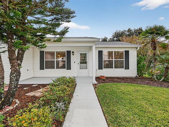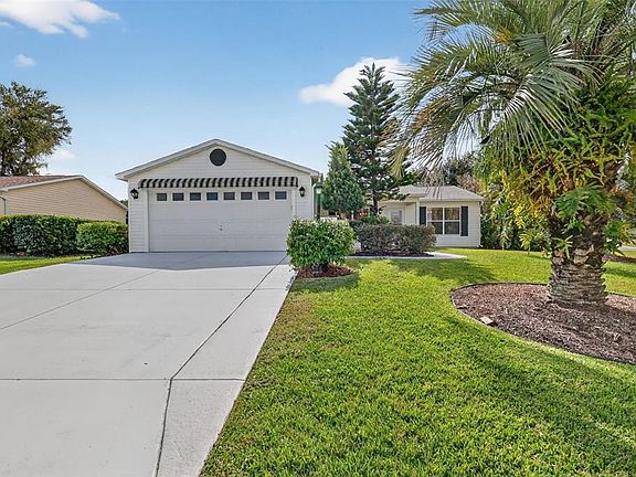 One or more photo(s) has been virtually staged. • NO BOND • 2021 ROOF & HVAC • FLORIDA ROOM • ENCLOSED LANAI  Located on a desirable corner lot in the sought-after Village of Santiago, this beautifully maintained 2-bedroom, 2-bathroom Stetson model offers updated systems and a thoughtfully designed layout. A charming covered front porch with a decorative leaded-glass front door welcomes you into an open, split floorplan featuring tile flooring throughout the living, dining, and kitchen areas. The kitchen boasts brand new stainless steel appliances and a convenient breakfast bar, perfect for casual meals and entertaining. Enjoy year-round comfort in the added Florida Room with new carpet, or relax in the enclosed lanai that opens to a private outdoor patio with a pergola, ideal for outdoor dining or lounging.     The primary suite features new carpet, a walk-in closet, and a private bath with a tub-shower combo. The guest bedroom includes a Murphy bed, new carpet, and a walk-in closet, while the guest bathroom is equipped with a stand-up shower.  An indoor laundry room with an extra refrigerator adds convenience, and the 2-car garage includes an insulated garage door for comfort and efficiency. Additional system upgrades include a 2020 gas tankless hot water heater, offering peace of mind and energy savings. Enjoy proximity to Spanish Springs (~0.6 mi), Lake Sumter Landing, Mallory Hill Golf Course, and nearby recreation centers with golf cart accessibility throughout The Villages.
