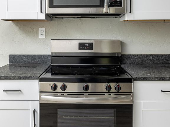 Newly remodeled kitchen with stainless-steel appliances (range, microwave, and dishwasher)