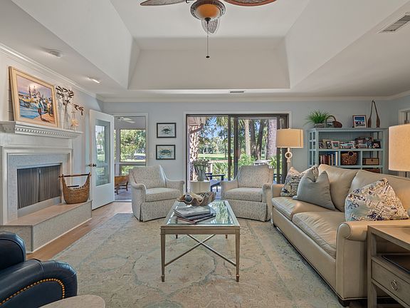 Inside, the residence is infused with light coastal blue hues and soothing neutrals, creating a welcoming and timeless atmosphere. Hardwood floors anchor the main living spaces, where a wood-burning fireplace and elegant palm-leaf ceiling fan add warmth and charm. The open living and dining area easily accommodates gatherings, with seating for eight and a seamless flow to the sunroom. Bright and inviting with views looking up to the Cougar Point Clubhouse, the sunroom serves as both a tranquil reading nook and a natural extension of the living space, leading to a spacious deck that overlooks the lush fairways.