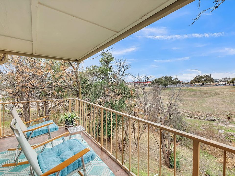 FULLY FURNISHED CONDO in the HEART of MARBLE FALLS, TEXAS! This hidden treasure has 1507sf with 3 beds and 2 full bathrooms AND large COVERED BALCONY with access from the LIVING AND the PRIMARY bedroom. Living Room 8’ glass sliding door WITH ELECTRIC SHADES provide views of a wooded draw. Front bedroom has an en-suite bathroom that also has HALLWAY ACCESS for guests. Secondary bedrooms have a well-designed jack and jill bathroom with a walk-in shower and separate sinks. Updates include plantation shutters, LVP wood-look flooring throughout; recent paint and recent appliances. Samsung STOVE WITH BUILT IN AIR FRYER; GE refrigerator and dishwasher; GE WASHER/DRYER COMBO UNIT in utility closet; all convey. ONE CAR GARAGE WITH OPENER included with Unit. Unit was occupied seasonally as winter retreat. SMALL CONDO REGIME; Dues $250/month. One block from HEB and ONE BLOCK from Hwy 281. Make this your new VACATION, STAYCATION RETREAT!