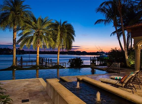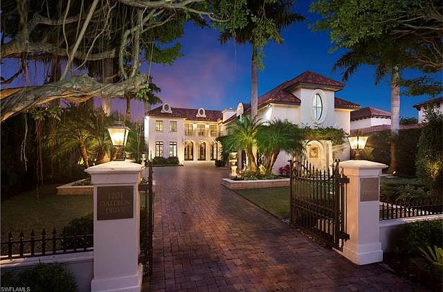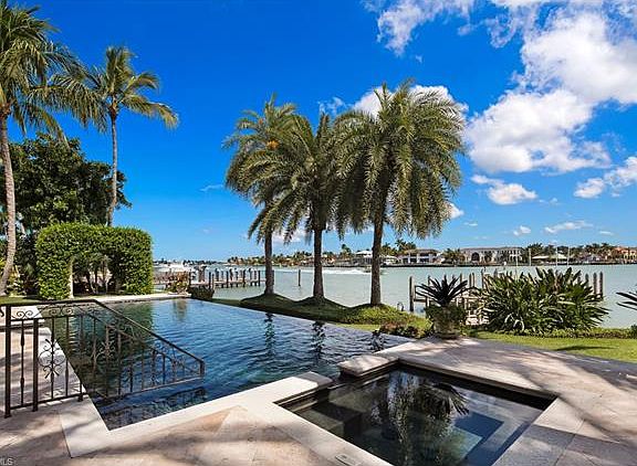 Elegance abounds in this luxurious, recently remodeled 10,000-square-foot, European-style home situated on sparkling Naples Bay in the heart of Port Royal. Beyond the gated entry are manicured gardens adorned with fountains, softly illuminated at twilight. Inside, the striking, two-story foyer features dual grand staircases leading to the second floor. Freshly remodeled and updated with fabulous finishes, the home features five bedrooms, six full bathrooms and four half-baths with master suite and privacy garden conveniently located on the first floor. The gourmet kitchen has top-of-the-line appliances, an adjoining wine room and a morning room with bay views. Other amenities include a theater, formal library, exercise room, and two elevators. A fully equipped, 1,100-square-foot attached casita is ideal for guests or staff. Overlooking the Bay is the spacious lanai with a full summer kitchen and fireplace. Beyond, the infinity-edge swimming pool with spa is surrounded by ample lounge areas and offers sweeping Bay views. A gorgeous second-floor lanai also affords views of the dock, boat lift and 180-degree water views.