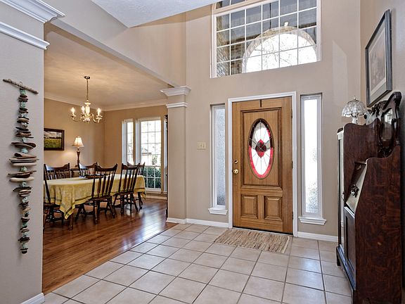 Remarkable David Weekley built home located on a quiet culdesac. 5 bedrooms, 4 baths. Downstairs owner and guest suites. Cheerful gourmet kitchen with built in double ovens. Great curb appeal, large detached garage with breezeway. Beautiful ceiling details and crown moulding make each room special. Split staircase adds flair and functionality with the large secondary bedrooms with good closets on one side and a gameroom on the other which helps control noise. Large pool in the backyard. Award winning Fern Bluff Elementary is within walking distance. Lower tax rate- no MUD!