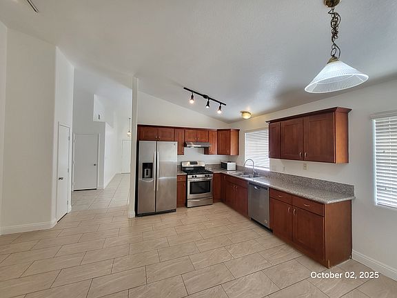 Low-maintenance desert landscapingTwo-car garageDual sinksSpacious primary suiteVaulted ceilingsPlenty of cabinet spaceStainless steel appliances