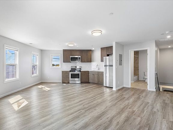 Stylish vinyl flooringNatural lightOpen floor planElegant stone countertopsPlenty of cabinet spaceModern kitchenGas stove