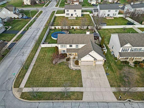 Discover the charm of this inviting 2-story home in the Hearthstone subdivision, nestled on a corner lot just a short stroll away from the park featuring a walking path. The 2-story foyer leads to a spacious formal living and dining area, perfect for hosting gatherings. The updated kitchen features new premium vinyl flooring, granite countertops, and stainless steel appliances, opening up to a large great room with a fireplace for winter warmth. Step into the expansive backyard oasis with a cement patio, gazebo with a firepit, and an above-ground pool with a deck, all enclosed by a privacy fence. The main level also includes an office/5th bedroom and a convenient half bathroom. Upstairs, the primary bedroom boasts vaulted ceilings, an ensuite bathroom, and a generous walk-in closet. Three additional bedrooms and a full bathroom complete the upper level. Add'l amenities include a heated garage, electric car charging station, garage storage cabinets, and whole house fan. Don't miss the opportunity to make this move-in ready home yours!
