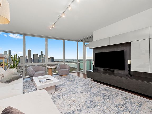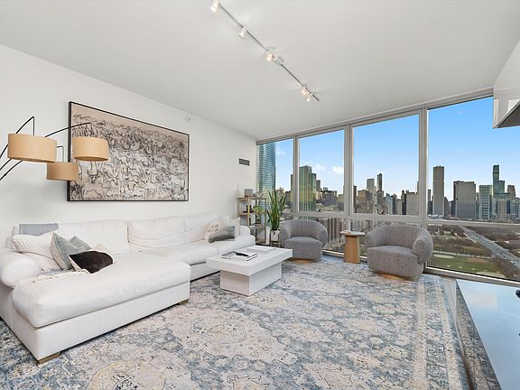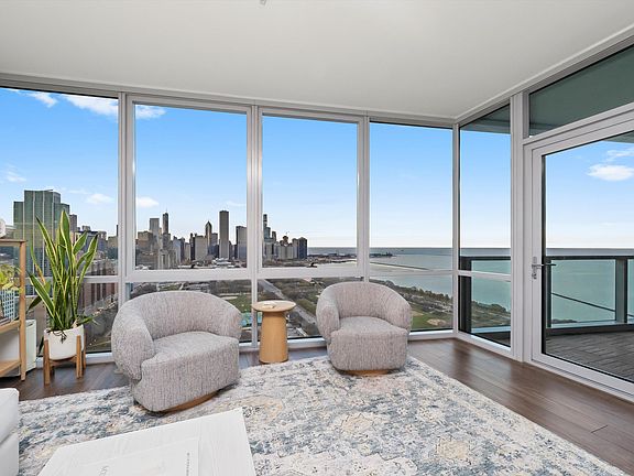 One of the South Loop's most prestigious addresses, this residence is ideally located at the southern edge of Grant Park, just steps from Chicago's iconic Museum Campus, Soldier Field, world-class dining, retail, and the beautiful shores of Lake Michigan. Upon entering, you're immediately met with spectacular, unobstructed views of the lake and city skyline-truly breathtaking and even more impressive in person. Relax on your private balcony and enjoy panoramic views of Lake Michigan, Navy Pier, Millennium Park, and Chicago's stunning skyline. This sleek and contemporary 2-bedroom, 2-bath condo with a den showcases high-end, custom finishes throughout. The modern chef's kitchen features white lacquer cabinetry, quartz countertops, under-cabinet lighting, and premium appliances including a Sub-Zero refrigerator, Bosch dishwasher, and Wolf range. The spacious primary suite includes a custom walk-in closet with built-in jewelry and laundry storage. Both the primary and second bedrooms feature designer wall coverings and remote-controlled, motorized blackout shades. The expansive living room and den area offer a custom entertainment center and a Sub-Zero wine column holding up to 110 bottles. Additional features include designer lighting, California Closets, wide-plank walnut flooring, automated blackout shades in both bedrooms (controlled from a single remote), a wine fridge in the den, and a full-size stackable washer/dryer. Premium heated garage parking available for an additional $50K. This five-star, full-amenity building offers 24-hour door staff, concierge, indoor pool, fitness center, sundeck, resident lounge, catering kitchen, children's playroom, theater room, and more. Prepare to be wowed by the views-this is the one you'll want to call home. Explore the property in 3D by clicking the 3D tour button for a full virtual walkthrough!