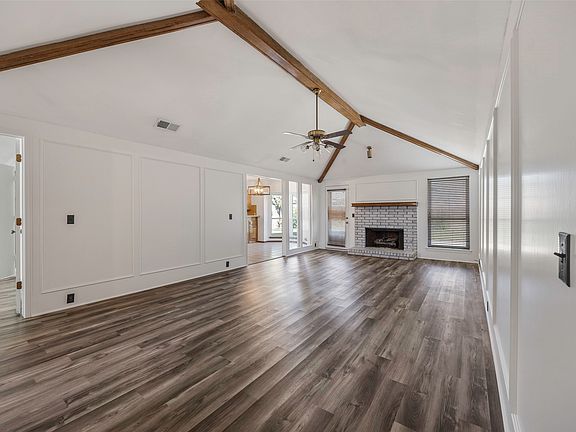 Welcome to this beautifully maintained single-story home offering 3 spacious bedrooms and 2 full baths, nestled in a peaceful, established neighborhood with no HOA. This inviting property boasts numerous upgrades including a new roof (2023), fresh paint throughout the home and garage, stylish laminate and tile flooring with no carpet, and a brand-new covered patio with ceiling fan (2023). The garage even features a professionally finished concrete painted floor (May 2025). Step inside to a large, open-concept living area with stunning wood paneling and exposed beams, creating a warm and welcoming atmosphere. The well-appointed kitchen includes neutral ceramic tile, black appliances, and ample space for cooking and entertaining. The oversized primary suite is thoughtfully positioned away from the secondary bedrooms for added privacy, and features a light-filled ensuite bathroom with skylight. Enjoy outdoor living in the generously sized, landscaped backyard with a private covered patio – perfect for relaxing or entertaining. A unique wrap-around driveway offers abundant parking for guests or additional vehicles.