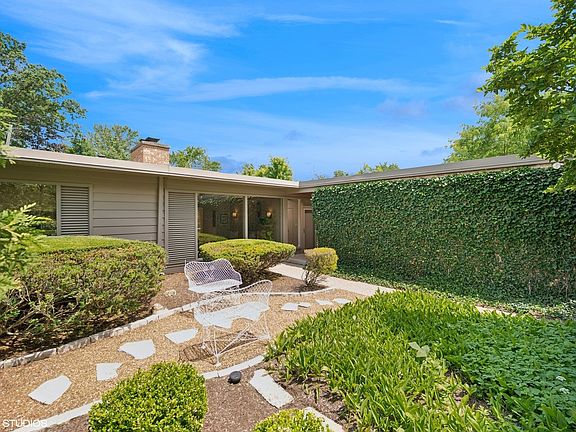 Nestled on serene Terrace Court with unmatched privacy and backing directly to the forest preserve, this expanded Keck & Keck ranch is a truly special Glencoe offering. With 2,800 square feet of refined living space, this 4-bedroom, 2-bathroom home seamlessly blends the timeless appeal of mid-century modern design with the comfort and functionality of modern amenities. French limestone floors flow throughout much of the home, adding an elegant touch to the airy, light-filled spaces. A spacious foyer with skylight and exposed brick wall immediately welcomes you with a sense of calm and sophistication. Floor-to-ceiling windows line the open-concept floor plan, flooding the home with natural light and showcasing the beautiful grounds. The family room, with its stunning views and double-sided fireplace shared with the expansive dining room, is a cozy yet striking focal point-perfect for both quiet nights and entertaining. Skylights, exposed beams, and signature Keck & Keck wood-paneled ceilings add warmth and architectural charm throughout. The chef's kitchen features a banquette, island, and high-end stainless steel appliances. A sunroom offers another beautiful brick fireplace and the perfect spot to unwind . Three generously sized guest bedrooms offer flexibility for home office space, while the primary suite is a luxurious retreat with a spa-like bathroom, large walk-in closet, and double doors leading to a peaceful brick paver patio. The backyard is a private, tranquil escape ideal for relaxing or hosting a summer barbecue. A well-appointed laundry room with built-in storage, heated two-car attached garage, and beautifully landscaped grounds round out this one-of-a-kind home in an unbeatable natural setting.